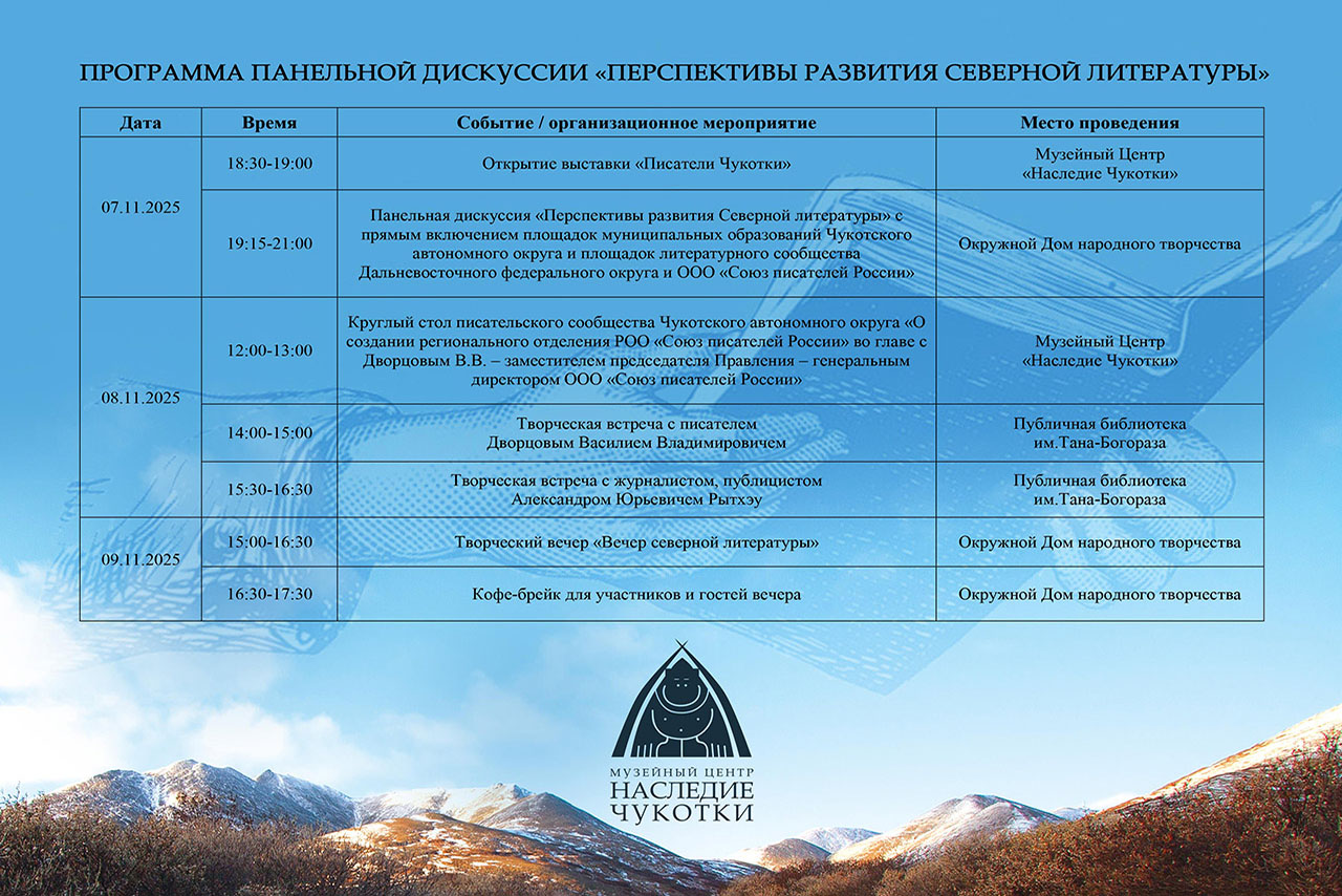 План мероприятий панельной дискуссии «Перспективы развития северной литературы», проводимой в рамках 95-летия со дня рождения классика чукотской литературы Юрия Сергеевича Рытхэу...