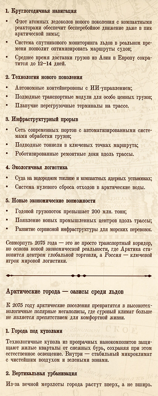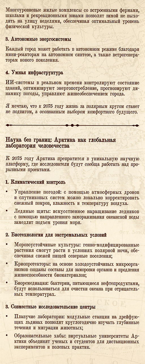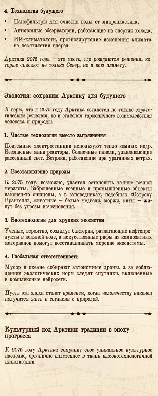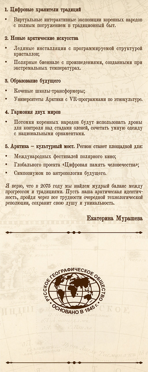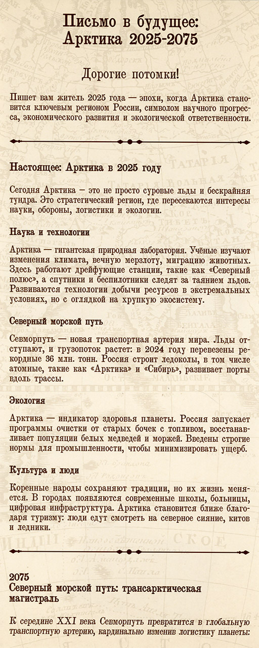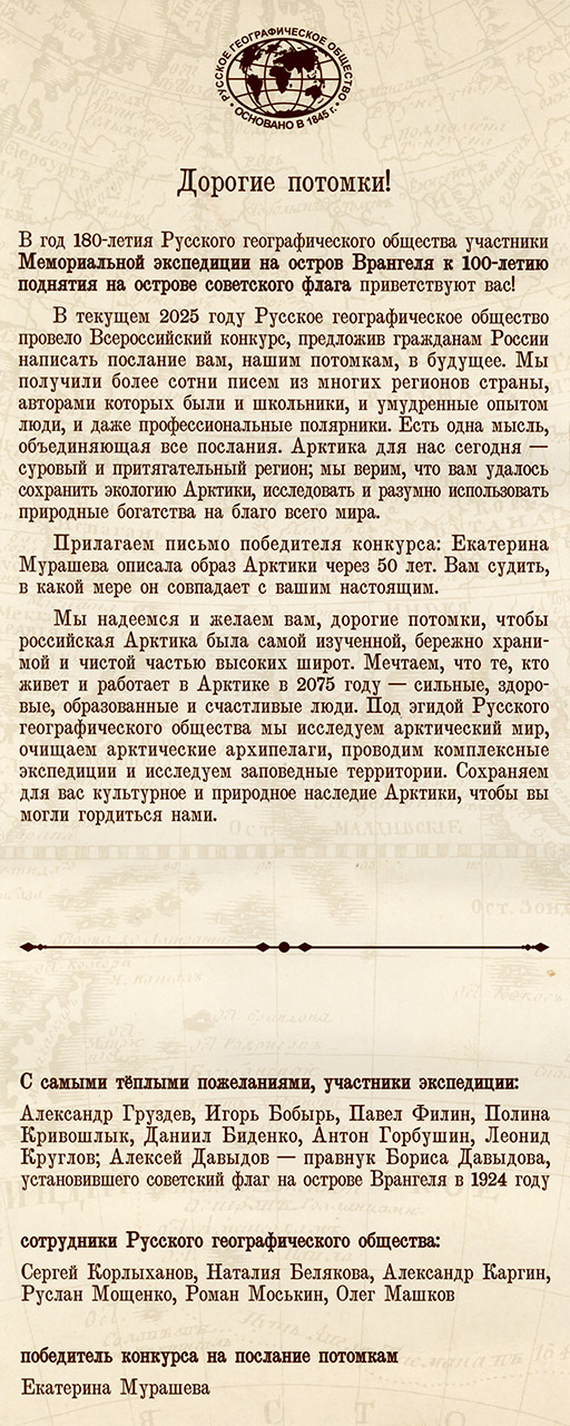 В текущем 2025 году Русское географическое общество провело Всероссийский конкурс, предложив гражданам России написать послание вам, нашим потомкам, в будущее. Мы получили более сотни писем из многих регионов страны, авторами которых были и школьники, и умудренные опытом люди, и даже профессиональные полярники. Есть одна мысль, объединяющая все послания. Арктика для нас сегодня — суровый и притягательный регион; мы верим, что вам удалось сохранить экологию Арктики, исследовать и разумно использовать природные богатства на благо всего мира.