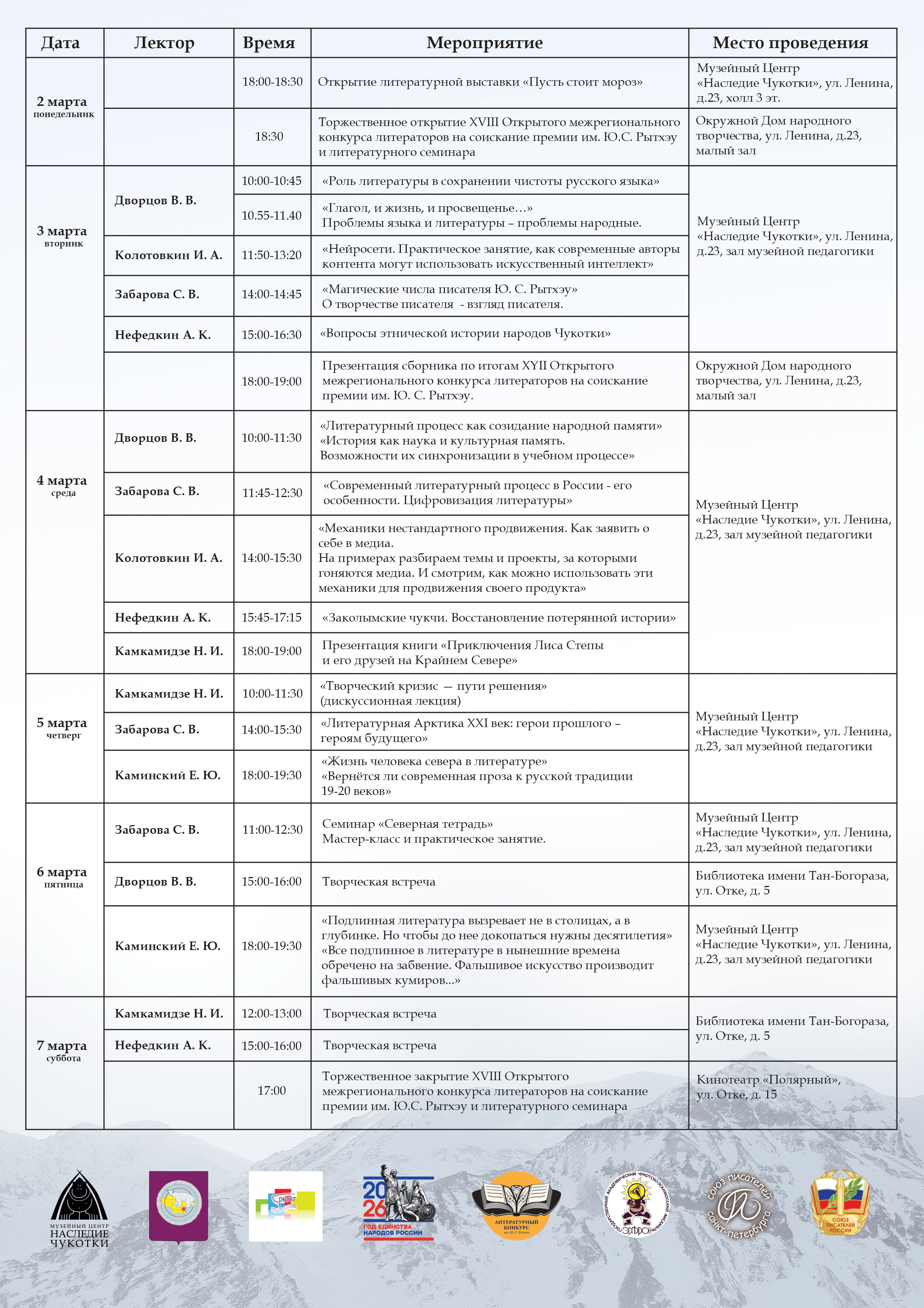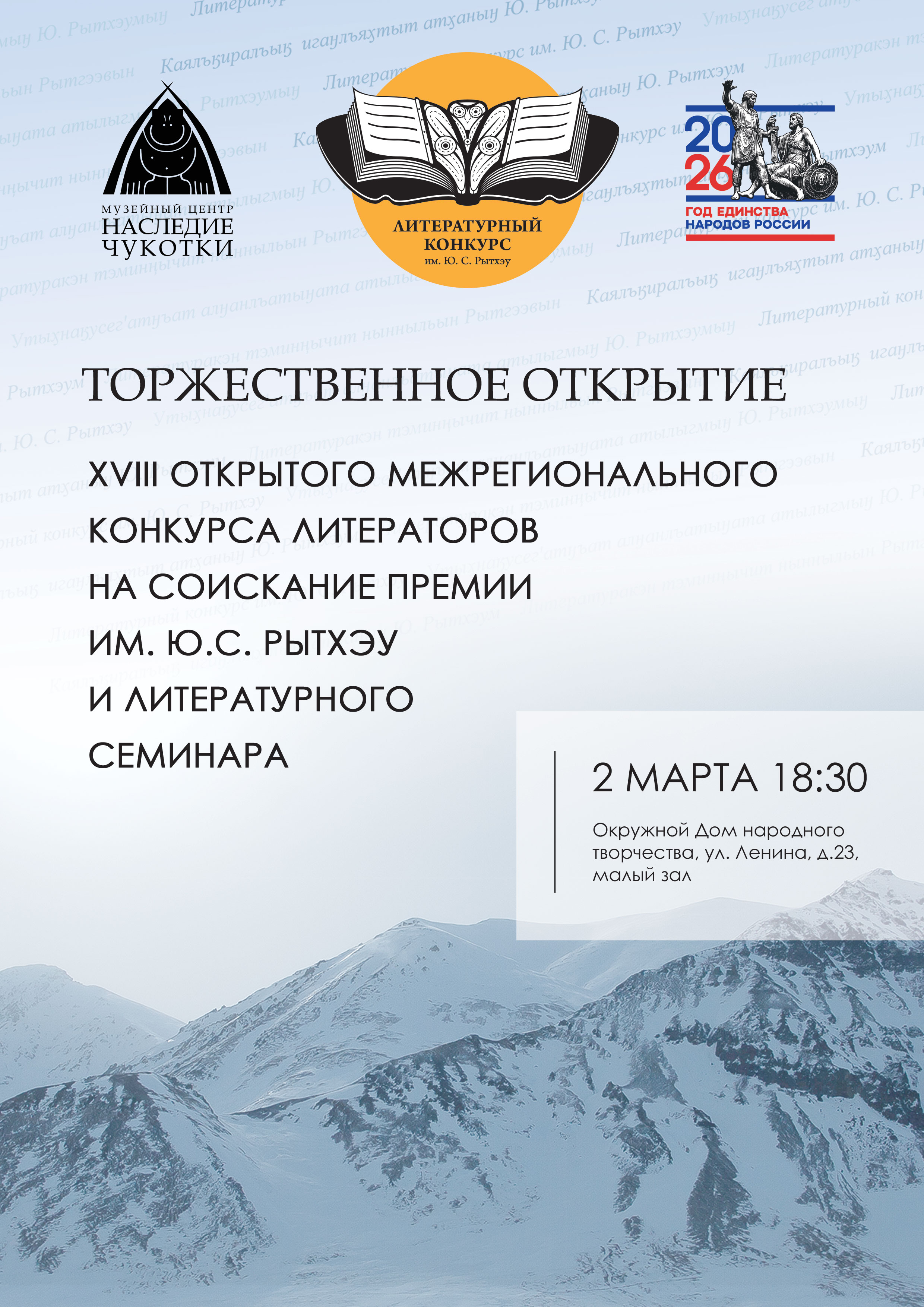 Дорогие друзья, 2 марта в 18:30 приглашаем Вас на торжественное открытие XVIII Открытого межрегионального конкурса литераторов на соискание премии им. Ю.С. Рытхэу и литературного семинара в Окружной дом народного творчества, малый зал. Знакомим Вас с программой семинара.