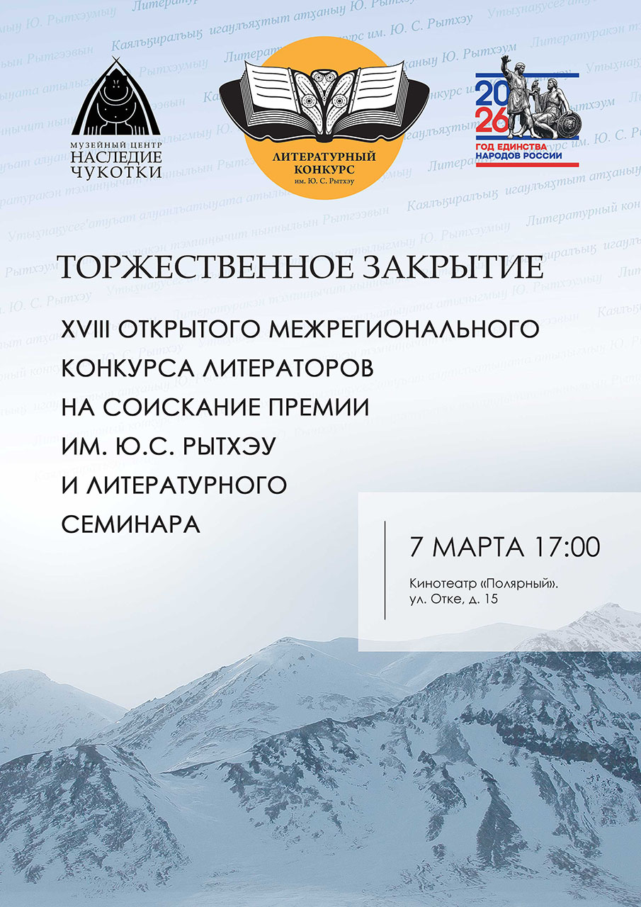 7 марта в 17:00 в кинотеатре «Полярный» состоится торжественное закрытие XVIII Открытого межрегионального конкурса литераторов на соискание премии им. Ю.С. Рытхэу и Окружного литературного семинара. Приглашаем всех желающих. Вход свободный.