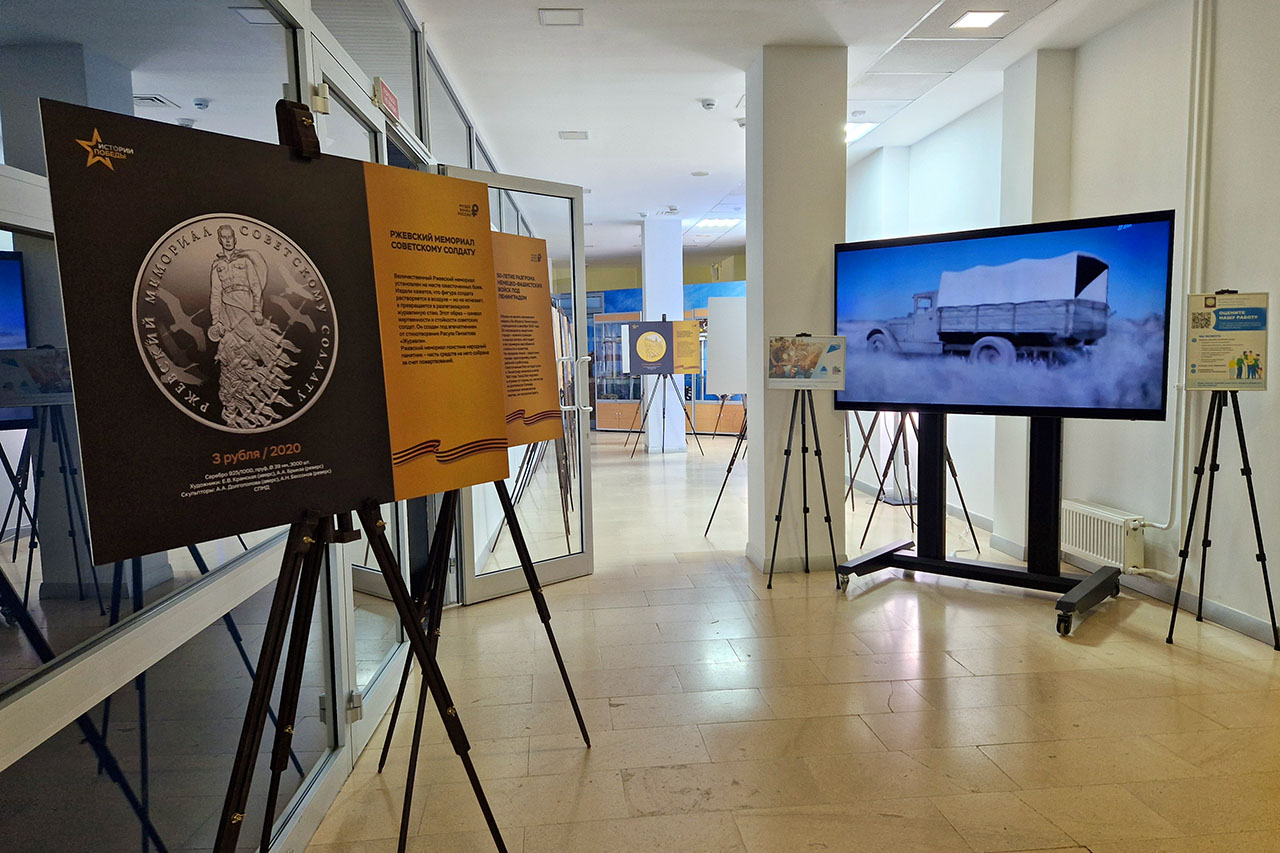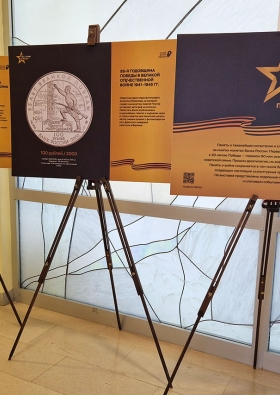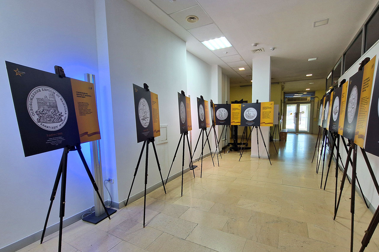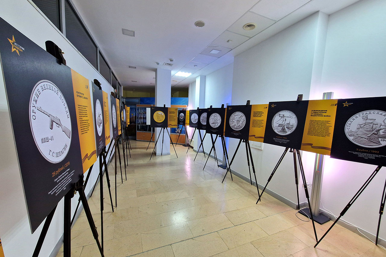 На выставке представлены 23 стенда с увеличенными фотографиями отдельных памятных монет, на которых изображены символы Победы и события военных лет. Среди них - легендарная боевая техника, памятники и мемориалы, ордена, ключевые военные операции: оборона Москвы, танковое сражение на Курской дуге, Сталинградская битва, освобождение Севастополя и Новороссийска, героизм партизан, прорыв блокады Ленинграда, взятие Берлина. Фотографии сопровождаются комментариями, раскрывающими значимость исторических событий.
